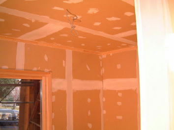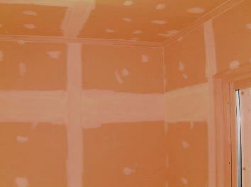 ドライウォールはテーピングで繋ぎ合せた石膏ボードで壁を作り、パテ等で下地を施し内装塗料を塗ります。